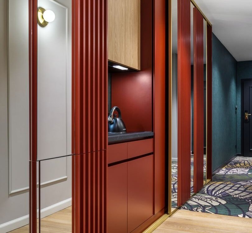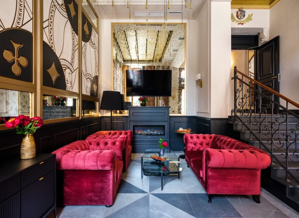 From the very first step, guests are drawn into the main theme of the facility - the queen made of playing cards. It's not just a visual concept, it's a philosophy that permeates every corner of the Golden Queen Hotel. From the moment you enter the lobby, where beautiful red sofas, a subtle fireplace and clear decorative elements empha this theme, to the carpets in the corridors and the door and floor markings - everything still tells the same story.