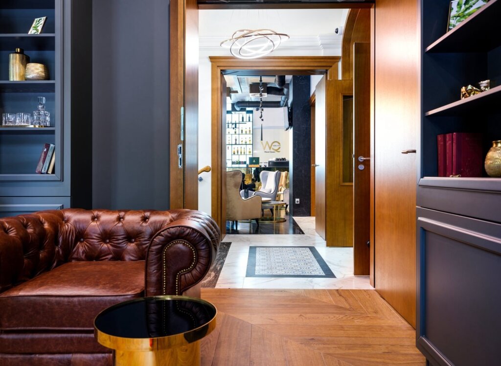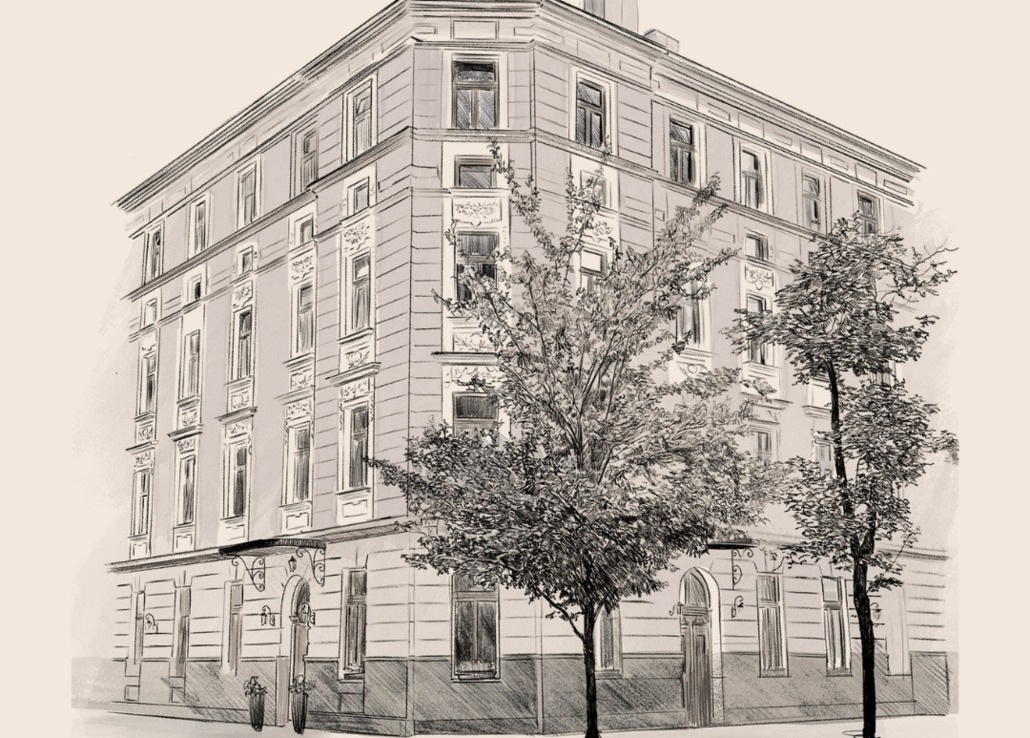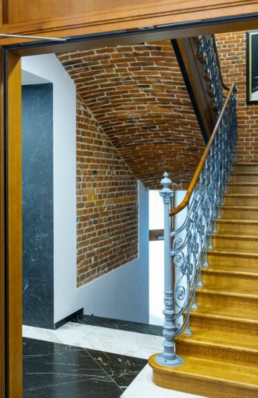 Detale historyczne zdobią również sień wejściową i klatkę schodową. Zostały wykorzystane oryginalne ozdobne kafle w formie dywaników na posadzce, odtworzono oryginalne zdobienia ścienne, drewniane schody oraz balustradę.