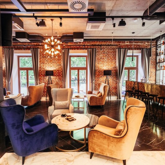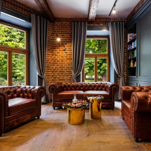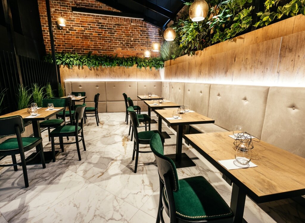 Na parterze i pierwszym piętrze zostały wykorzystane oryginalne odrestaurowane drewniane belki, które pełniły w budynku funkcję konstrukcyjną.